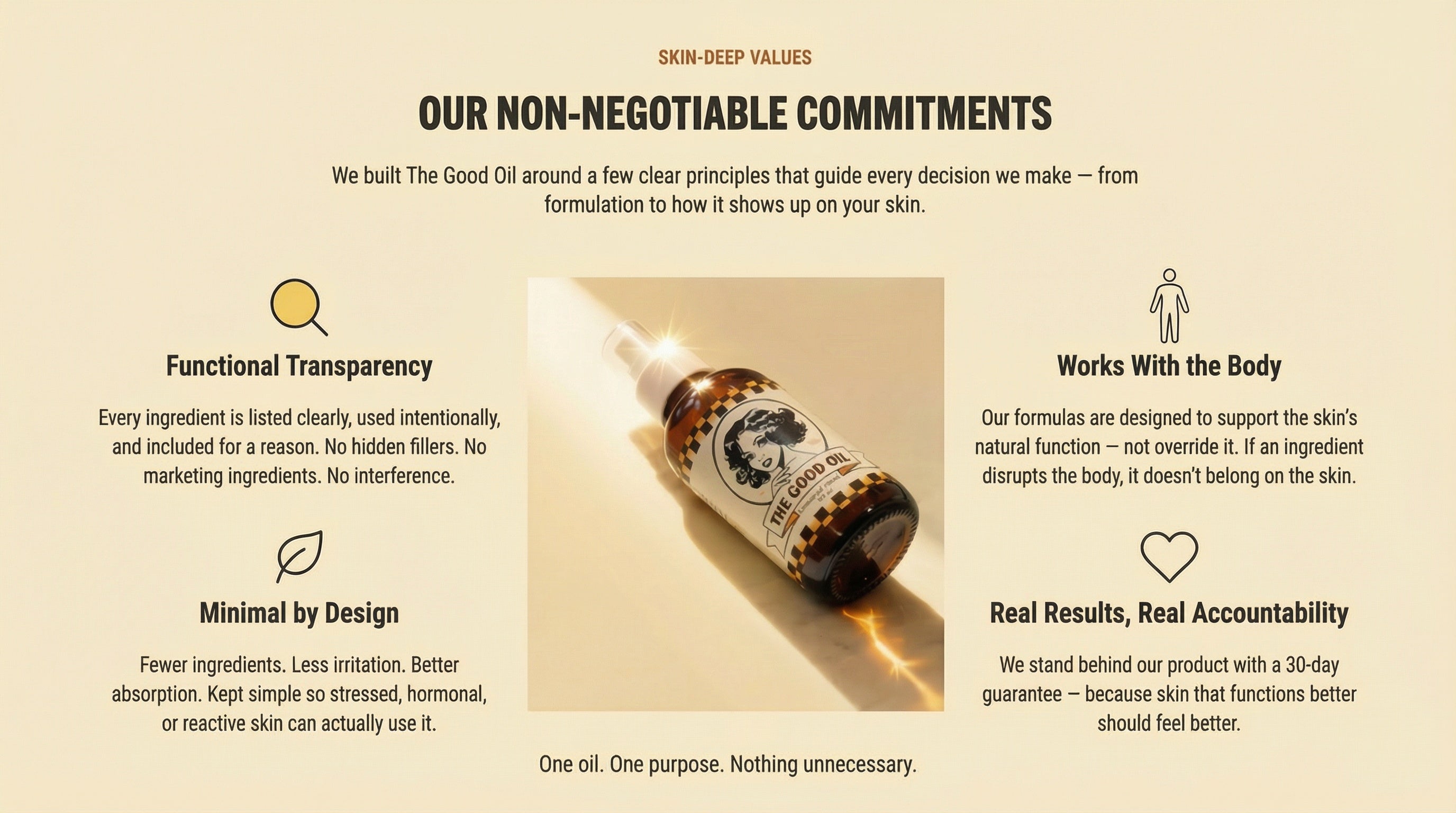 The Good Oil is designed tosupport skin function, helping it absorb nourishment and maintain moisture longer — without unnecessary ingredients.